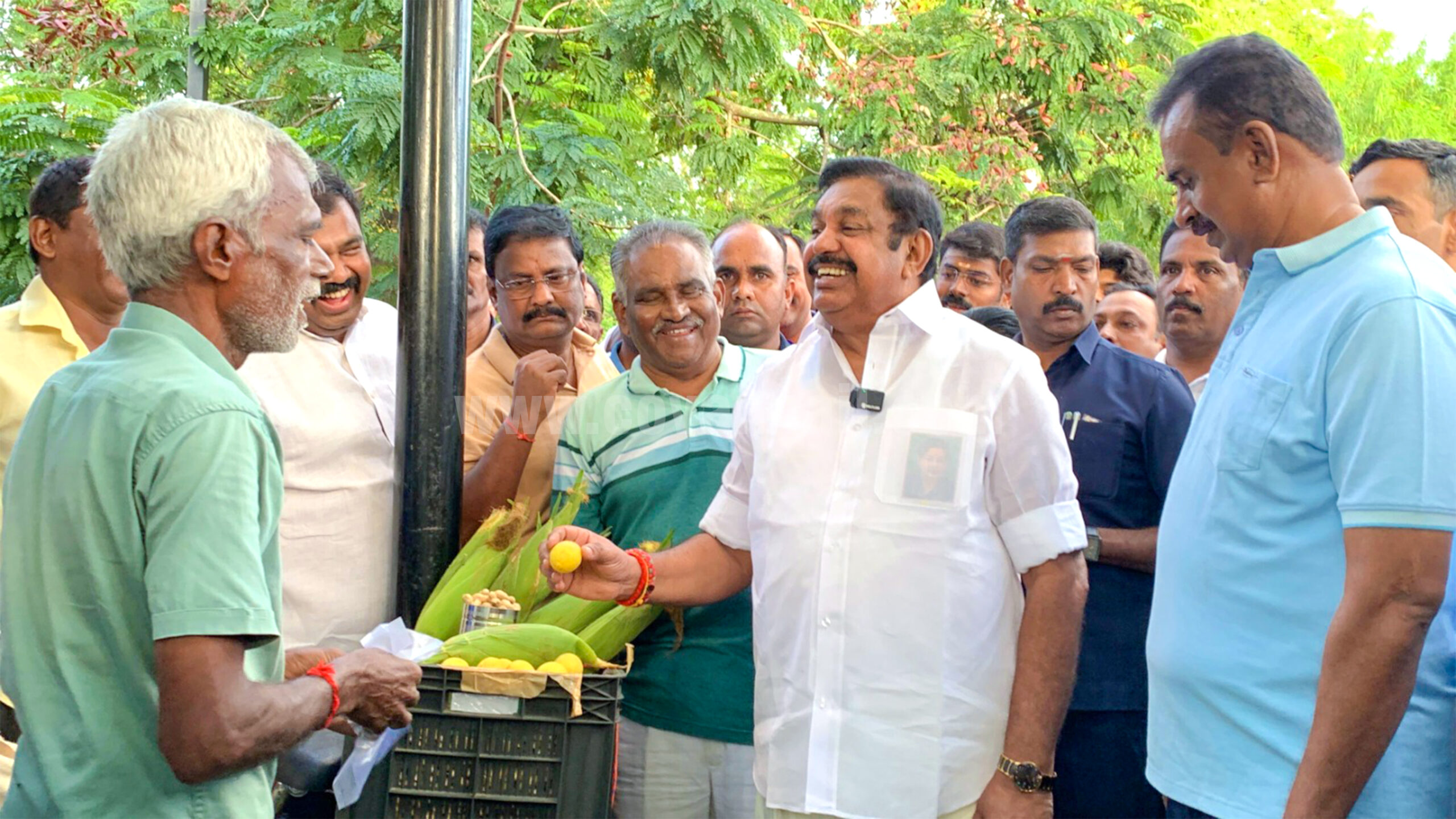 அவருடன் முன்னாள் அமைச்சர் எஸ்.பி.வேலுமணி, சட்டமன்ற உறுப்பினர்கள் கே.ஆர்.ஜெயராம், அம்மன் அர்ஜூனர் ஆகியோர் உடன் இருந்தனர். நடைப்பயிற்சியின்போது சாலையோர வியாபாரியிடம் ரூ.100க்கு 20 எலுமிச்சை பழங்களை வாங்கினார். வியாபாரியிடம் பிற உணவுப் பொருட்களின் விலையைக் கேட்டறிந்தார்.