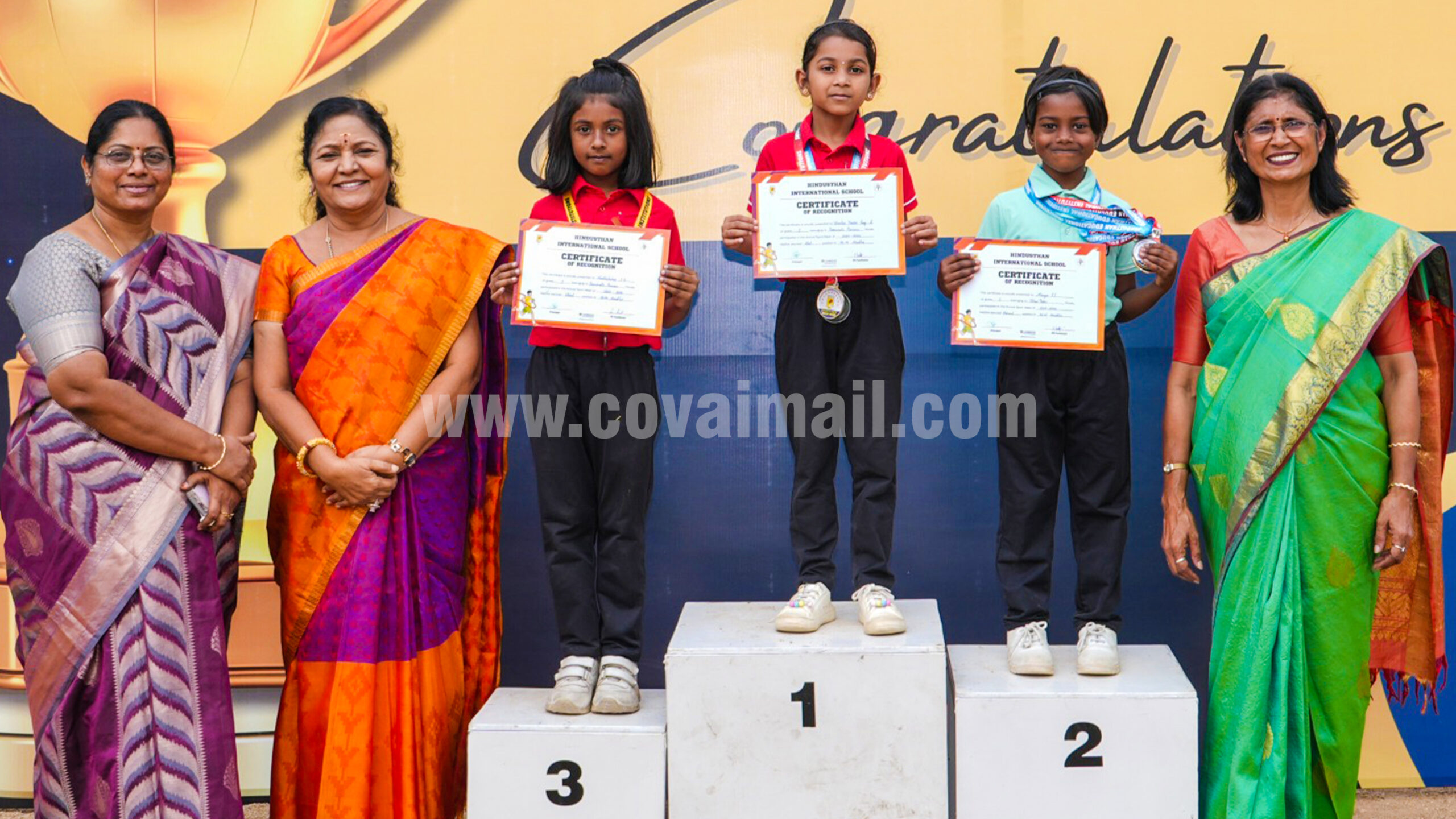 இந்துஸ்தான் கல்வி நிறுவனங்களின் நிர்வாக அறங்காவலர் சரசுவதி கண்ணையன், செயலாளர் பிரியா, நிர்வாக இயக்குனர் சதீஷ்பிரபு, டிரஸ்டி யமுனா சக்திவேல் ஆகியோர் வெற்றி பெற்ற குழந்தைளுக்கு பரிசுகளை வழங்கினர். பள்ளியின் முதல்வர் சுஜா, மாணவர்கள், பெற்றோர்கள் கலந்துகொண்டனர்.