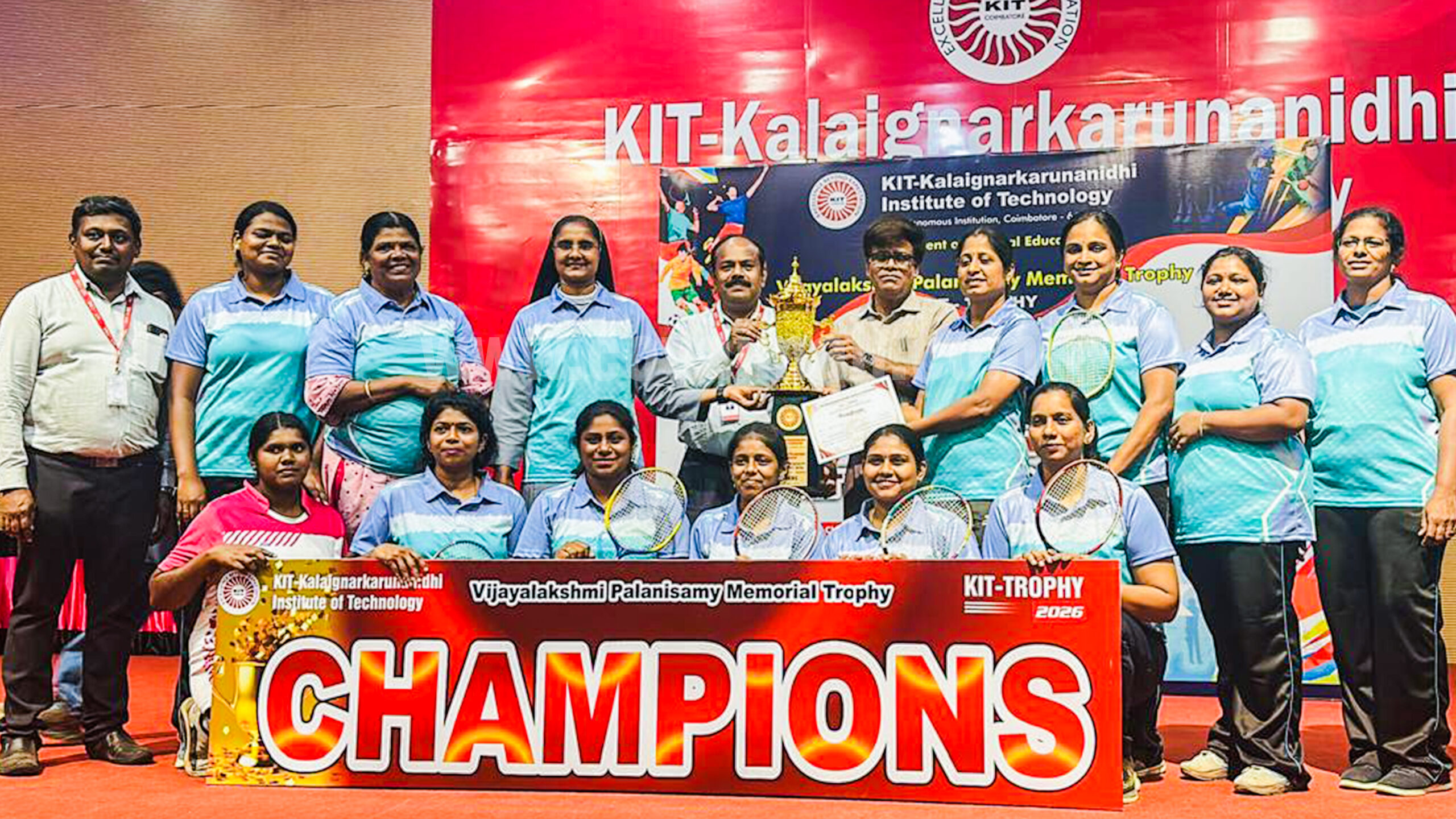 The Staff Ball Badminton Team of Nirmala College for Women participated in the KIT Trophy – State Level Faculty Sports Meet 2026, held at Kalaignar Karunanidhi Institute of Technology recently. The team secured first place and lifted the Vijayalakshmi Palanisamy Memorial Trophy.