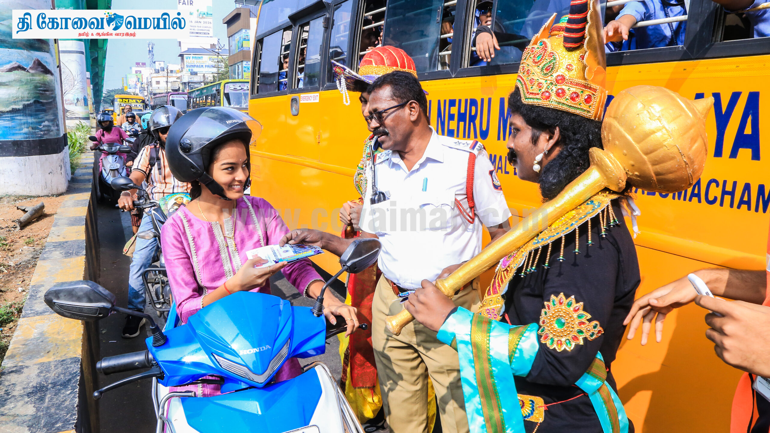 இதில் கொங்குநாடு கலை மற்றும் அறிவியல் கல்லூரியைச் சேர்ந்த மாணவர்கள் விழிப்புணர்வு ஏற்படுத்தினர். ஹெல்மெட், சீட் பெல்ட் அணிந்து சாலை விதிகளை முறையாகப் பின்பற்றிய வாகன ஓட்டிகளுக்கு சாக்லேட் மற்றும் ‘நல்ல சாலைப் பயனர்’ அட்டைகள் வழங்கப்பட்டது. சாலை விதிகளை பின்பற்றாதவர்களுக்கு விழிப்புணர்வு ஏற்படுத்தும் வகையில் சாலை பாதுகாப்பு எச்சரிக்கை அட்டைகள் வழங்கப்பட்டன.