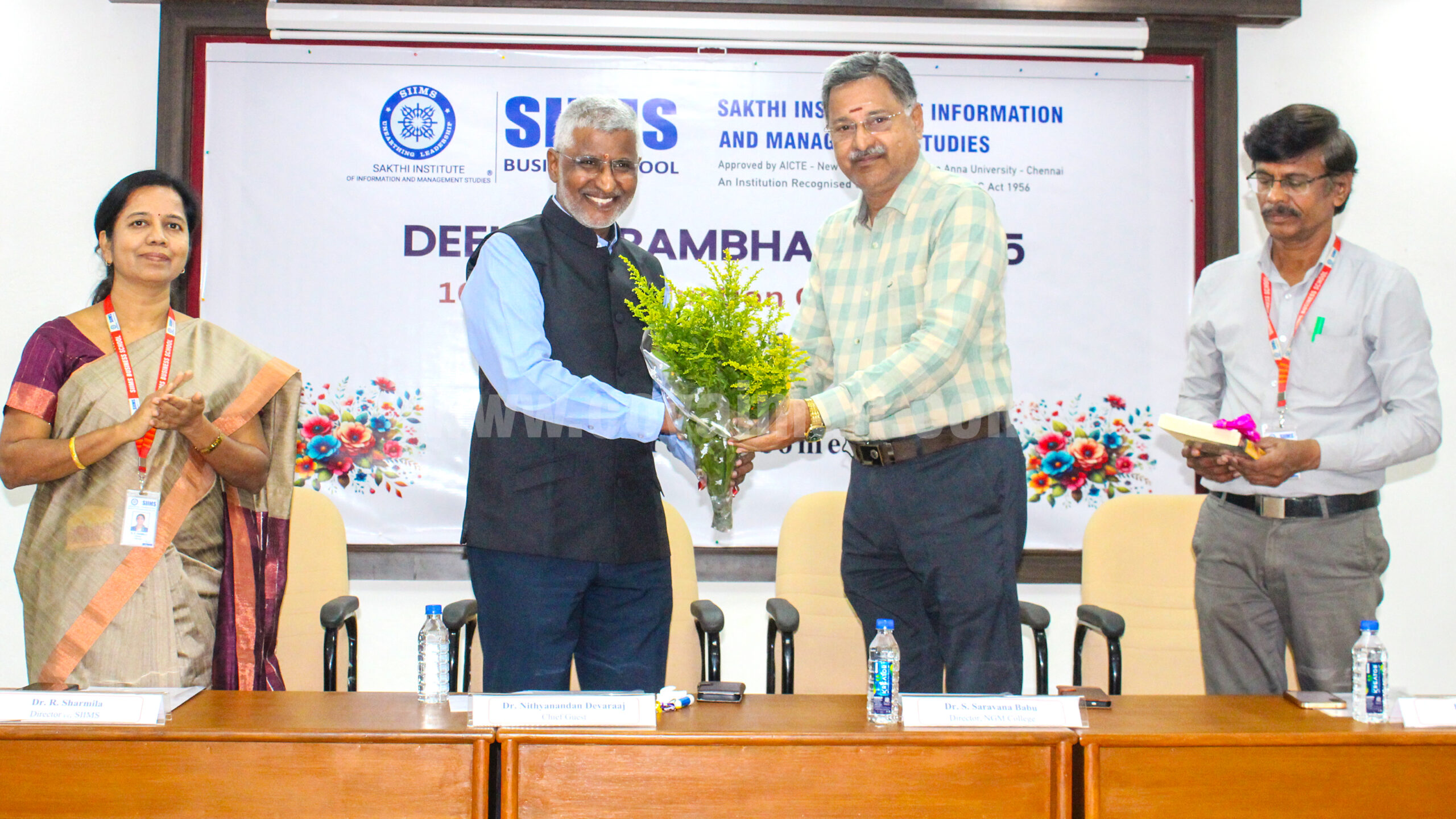 சிறப்பு விருந்தினராக கோவை மேலாண்மை சங்க தலைமை நிர்வாகி மற்றும் ஃப்ளோ லிங்க் சிஸ்டம்ஸ் பி லிமிடேட் தலைவர் நித்யானந்தன் தேவராஜ் கலந்துகொண்டு பேசியதாவது: மேலாண்மை கல்வி ஒரு கலை. ஒவ்வொரு வீட்டிலும் குடும்ப தலைவிகளாக உள்ள தய்மார்களே முதன்மையான மேலாளர் ஆவார். மேலும் மனிதர்களை மதித்து நடக்கும் பண்பு வேண்டும். நல்ல மனிதரே நல்ல தலைவராகிறார். நாட்டு நடப்பு மற்றும் பொருளாதாரத்தை அறிந்துகொள்ள தினமும் செய்தித் தாள் படிக்க வேண்டும். கல்வியை மகிழ்ச்சியாக சந்தோசமாக கற்க வேண்டும் எனக் கூறினார்.