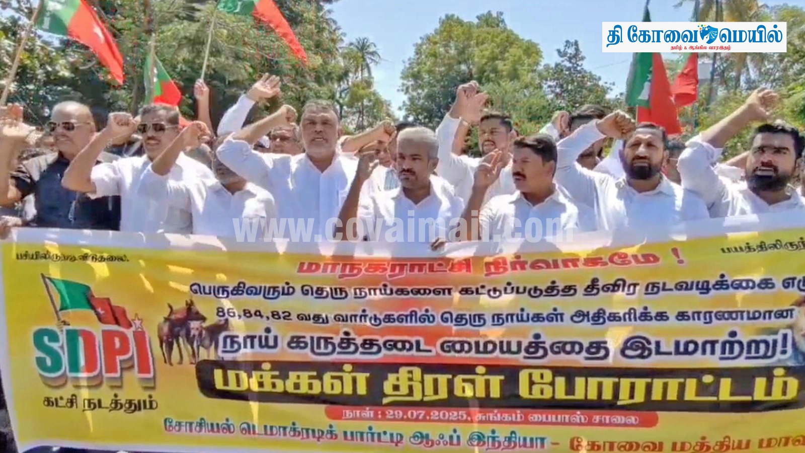 கோவை மாநகராட்சி நிர்வாகத்தை கண்டித்து எஸ்டிபிஐ கட்சி சார்பில் செவ்வாய்க்கிழமை (29.07.2025) புல்லுக்காடு பகுதியில் அமைந்துள்ள நாய் கருத்தடை மையம் முன்பு பெரும் அளவில் போராட்டம் நடைபெற்றது. இதில் 100-க்கும் மேற்பட்ட எஸ்டிபிஐ உறுப்பினர்கள் மற்றும் பொதுமக்கள் கலந்து கொண்டனர்.