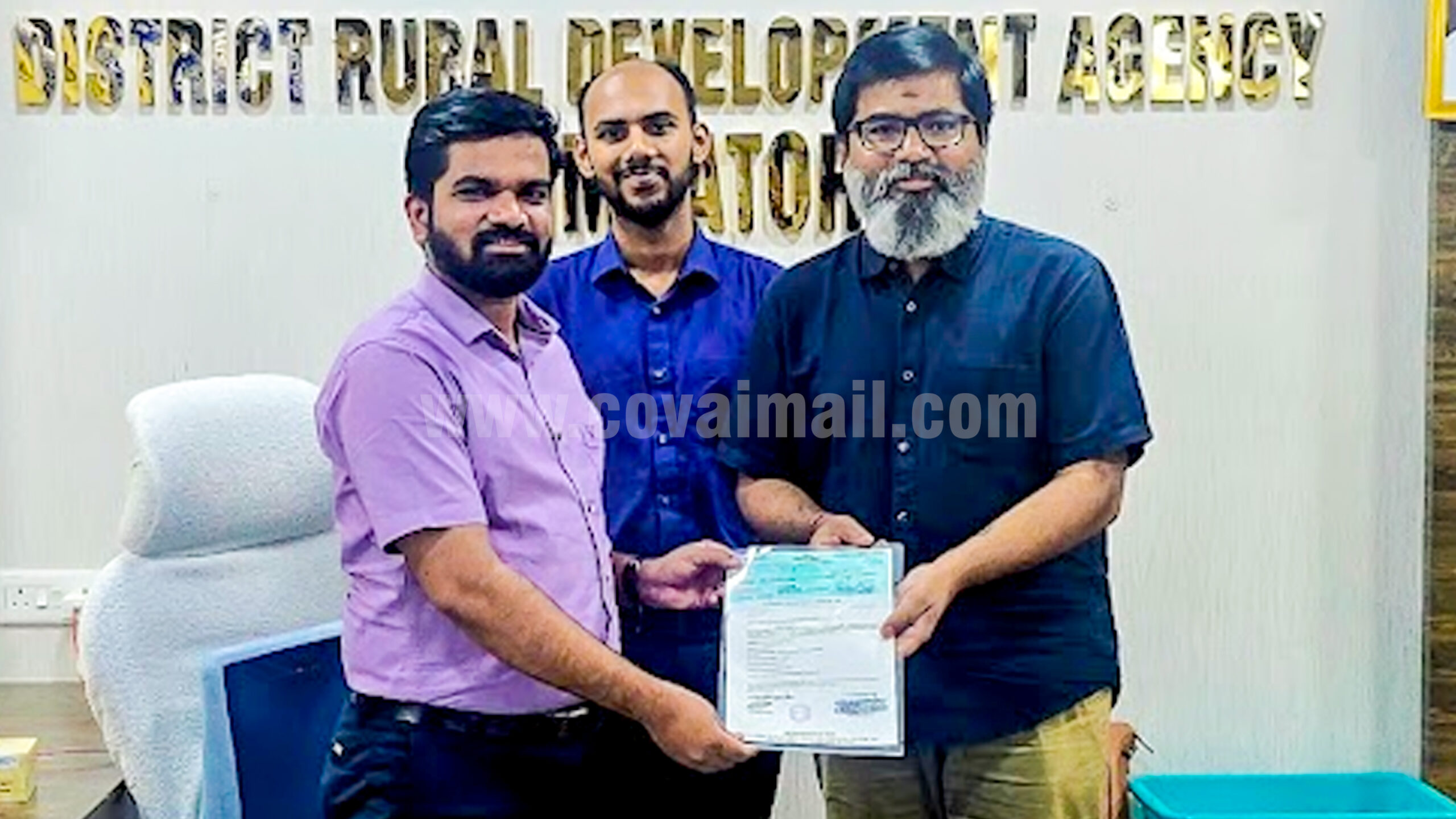At a formal handover event, Sivaraman Kandasamy, Managing Director of Tanny Shelters, presented a cheque for ₹3.9 lakhs to Sanket Balwant Waghe, Additional Collector (Development) and Project Director, DRDA Coimbatore.